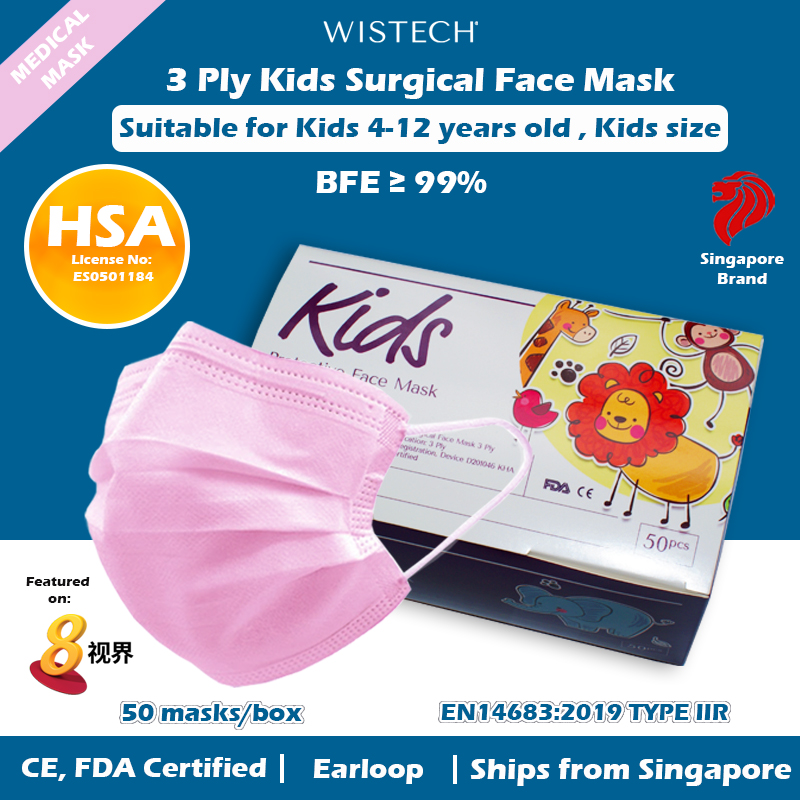 [OFFICIAL STORE] GET ADDITIONAL % OFF (Pink/others) Wistech 3 Ply Kids Surgical Mask, Protective Mask, Kids mask, Kids size, 4 to 12 years old, 50 pieces, HSA Notified Medical Device, FDA CE Approved,