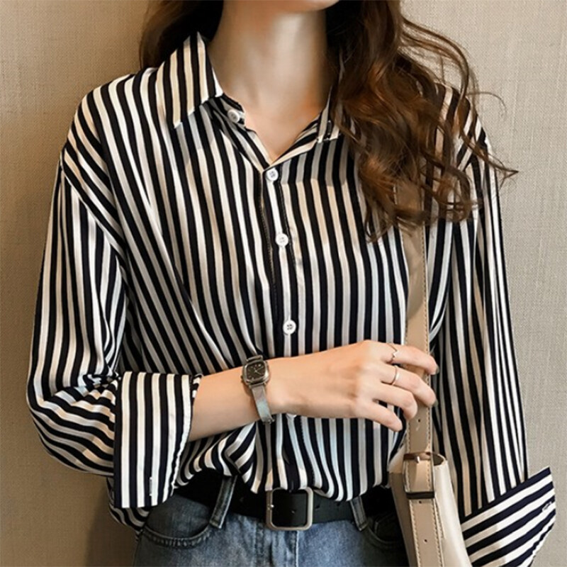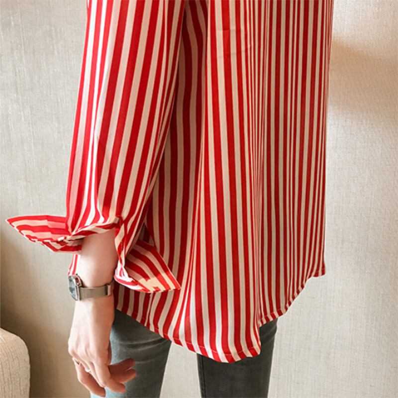 Vanessawang Korean Women Plus Size Blouse Stripe Loose Slim Casual V Collar Buttons Shirt