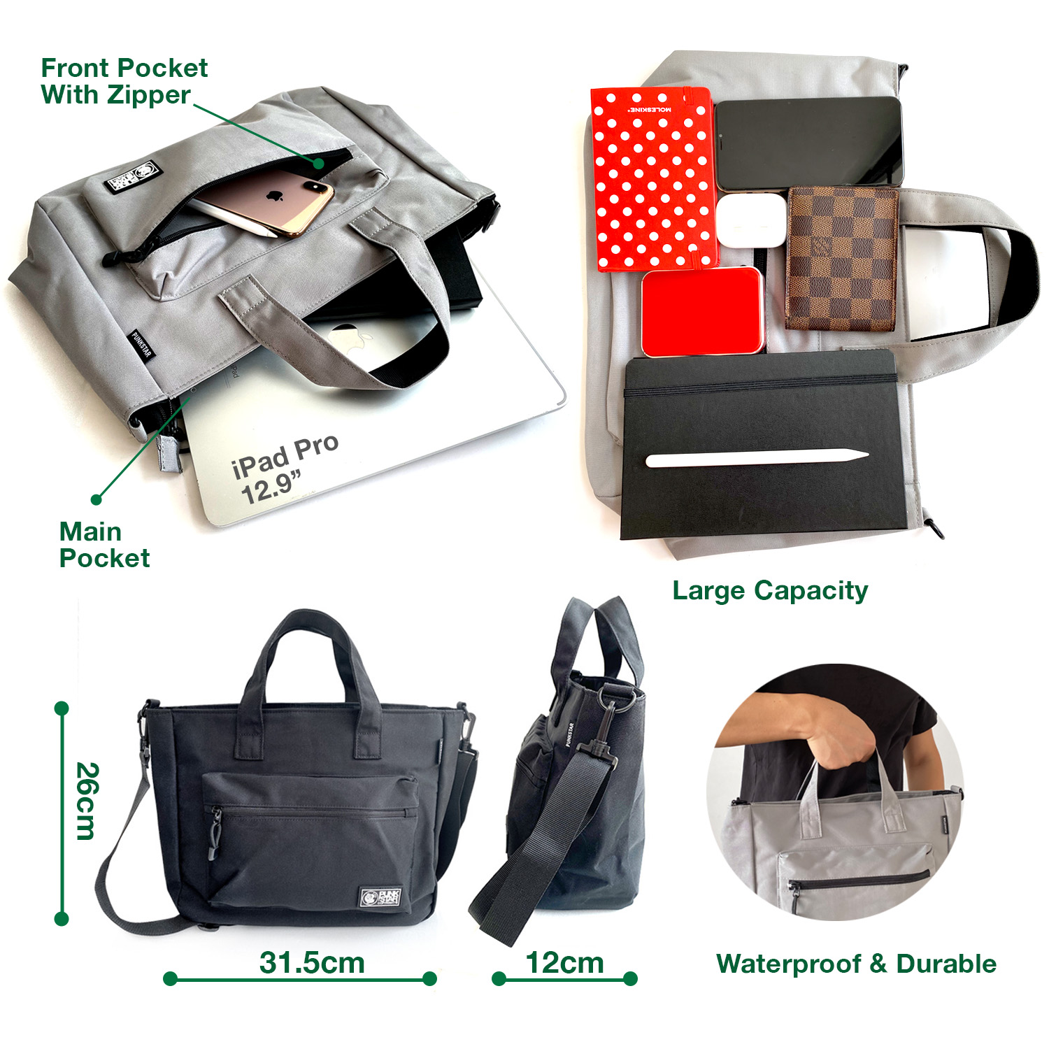 PUNKSTAR Water Resistant Lightweight Tote bag with Removable Shoulder Strap Casual Shoulder Work Laptop iPad Bag Crossbody for Shopping Office work School Travel for Women & Men