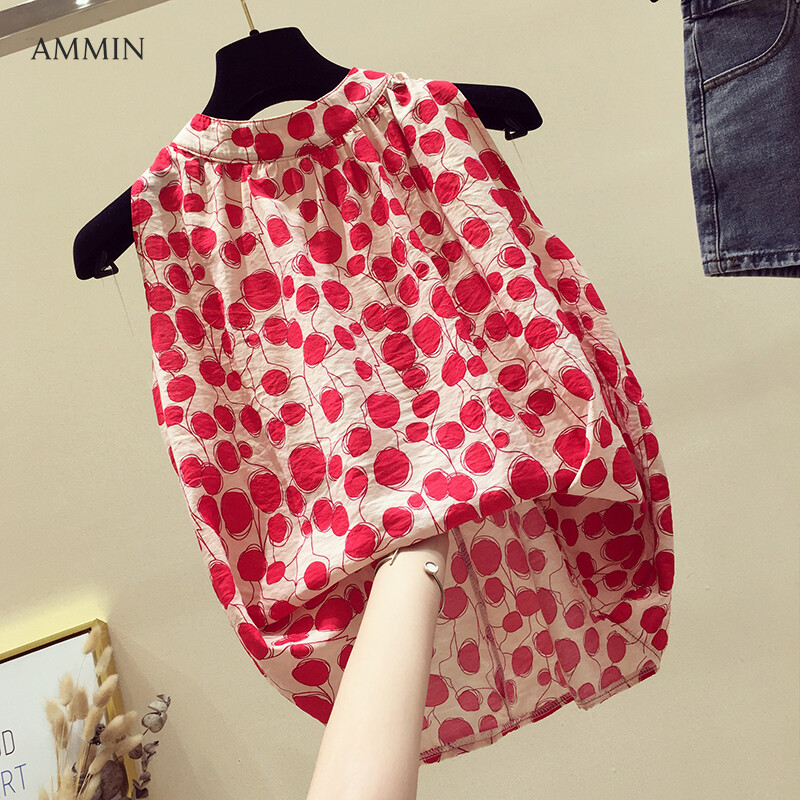 AMMIN Sleeveless chiffon t-shirt women's 2021 summer new Korean style loose floral printing off-shoulder foreign style small shirt leaking shoulder sweet blouse top