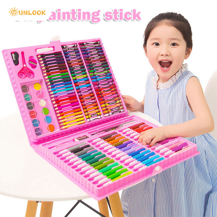 86-piece set: 24 watercolor pens, 12 crayons, 12 oil pastels, 12 colored pencils, 12 pressed powders, 1 palette, 1 painter, 1 eraser, 1 pencil, 1 pencil sharpener Pieces, 1 ruler, 1 scissors, 5 paper clips, 1 sponge, and 1 bottle of glue.