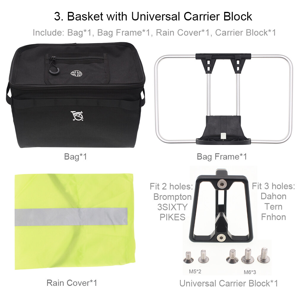 3. The "Basket with Universal Carrier Block" option: it fit Brompton, 3SIXTY, PIKES and fit 3 hole DAHON, 3 Hole Tern, 3 hole Fnhon, 3 hole Crius.
