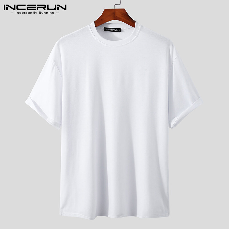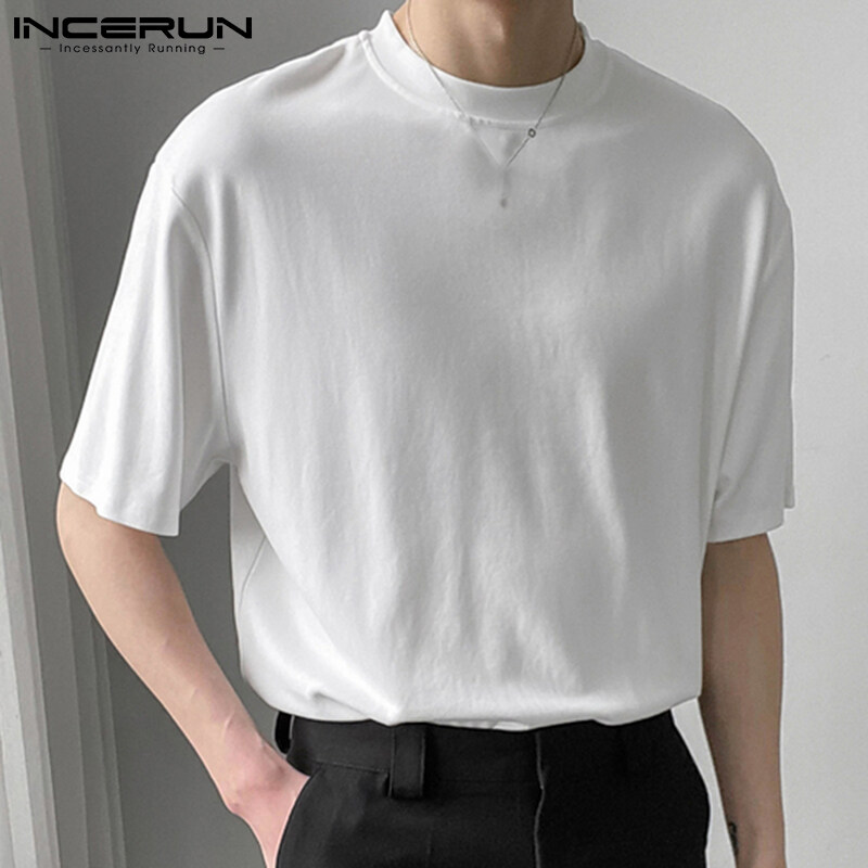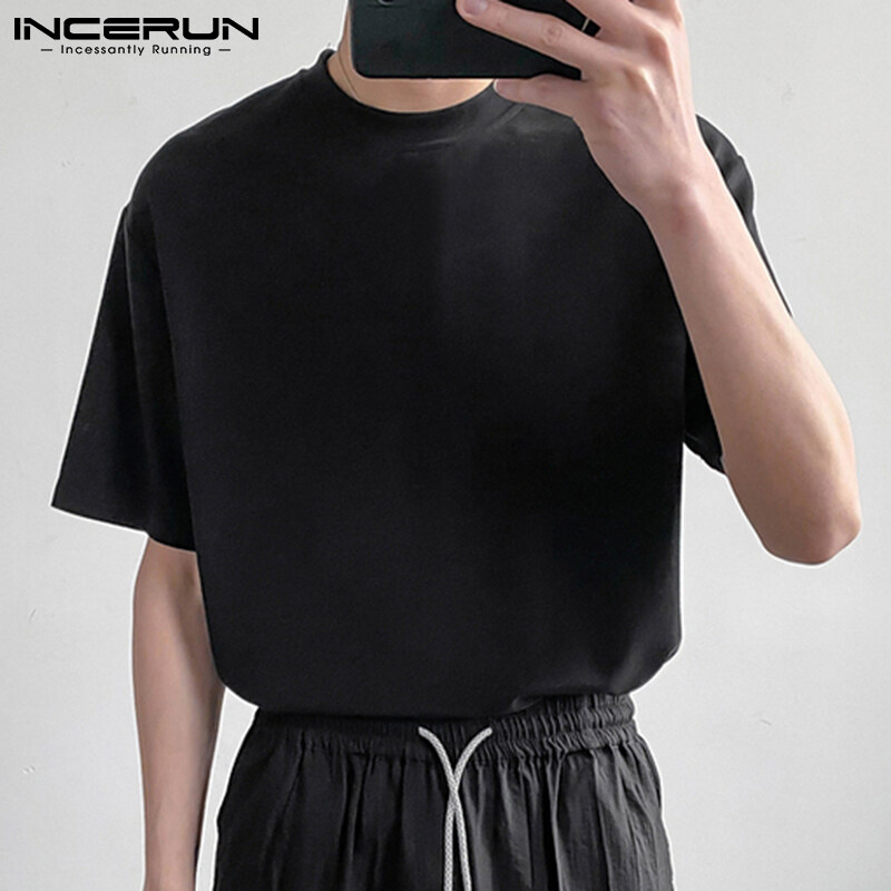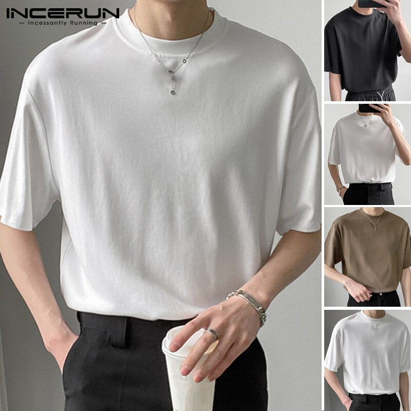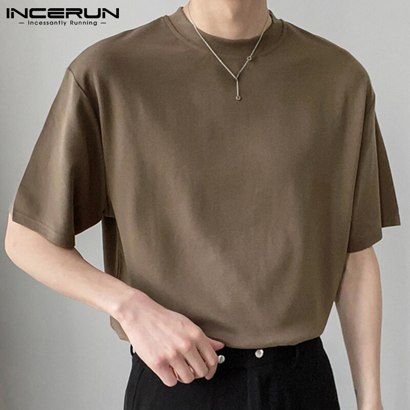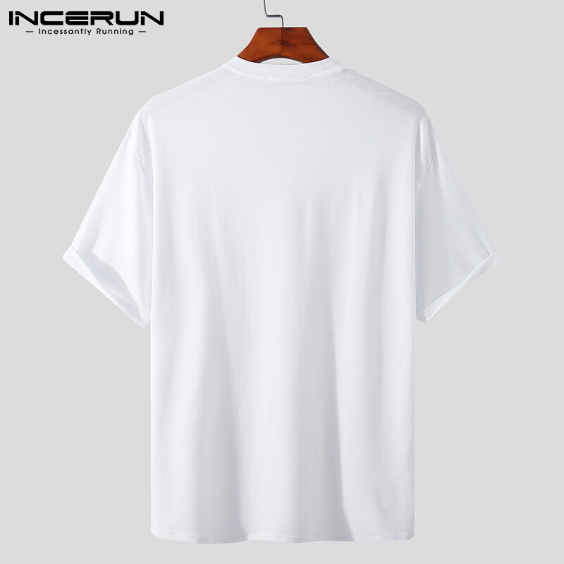 INCERUN Mens Crew Neck Short Sleeve T Shirt Formal Smart Shirt Holiday Fit Blouses (Korean Style)
