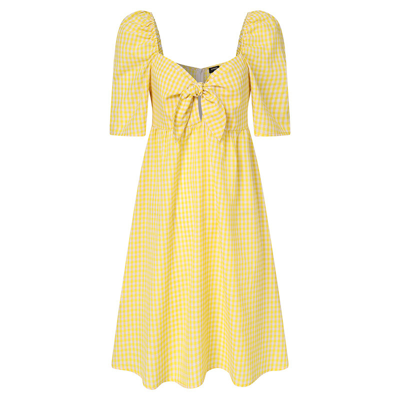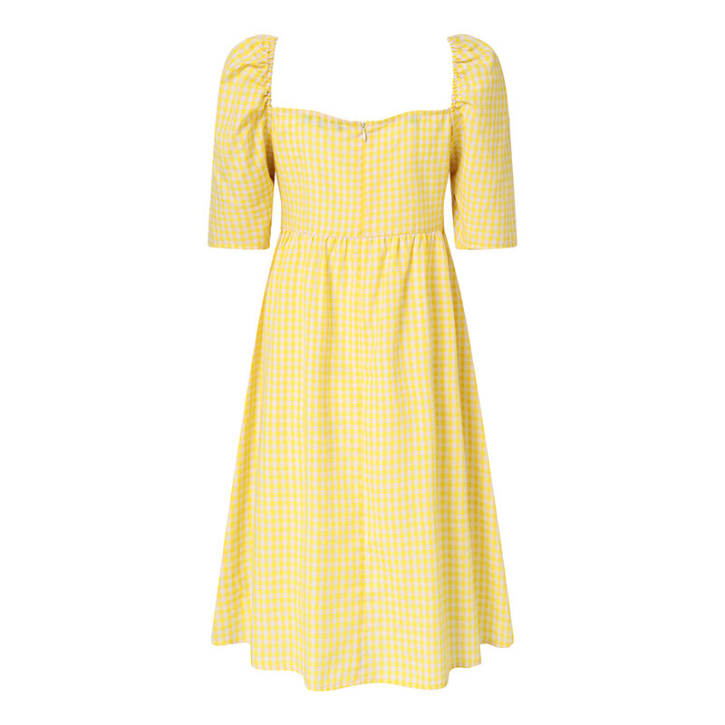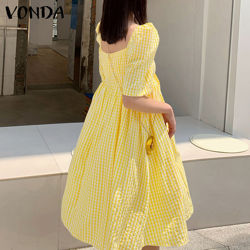 VONDA Womens Summer Shirt Dress Puff Sleeve Sundress Plaid Printed Casual Tunic Dress (Korean Causal)