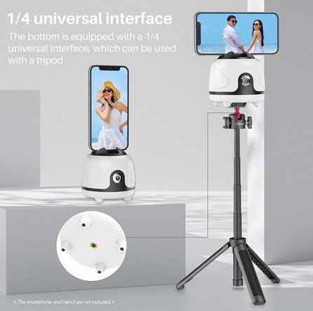 ▶【Wide Compatibility】Comes with a standard ¼" interface at the bottom, you can take your pocket-sized face tracking phone holder anywhere, and record every moment to mount it to your tripod or other devices via standard ¼" screw thread. This phone holder could work. The mounting design allows you to use it with any size cell phone. Perfect for iPhone or Android.