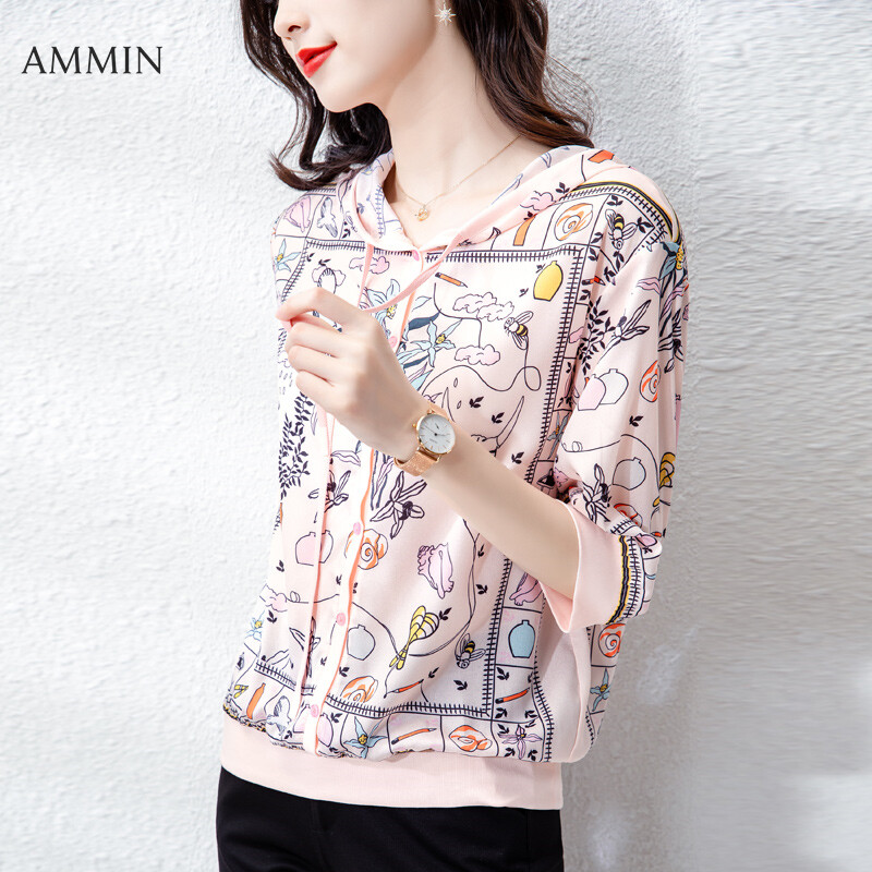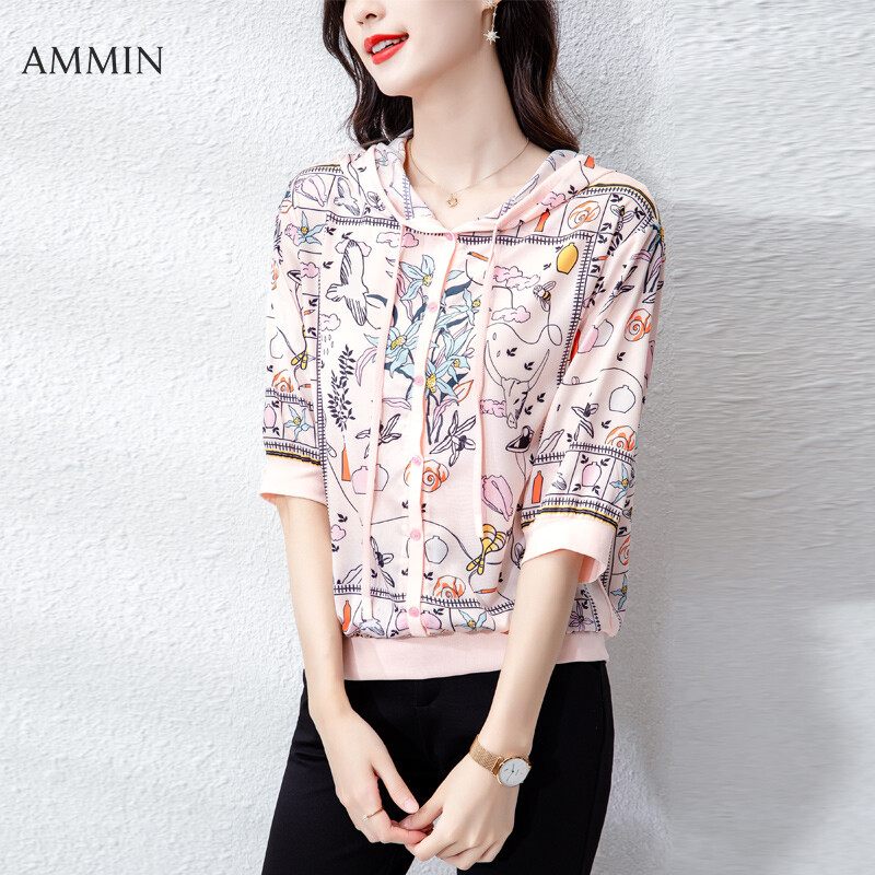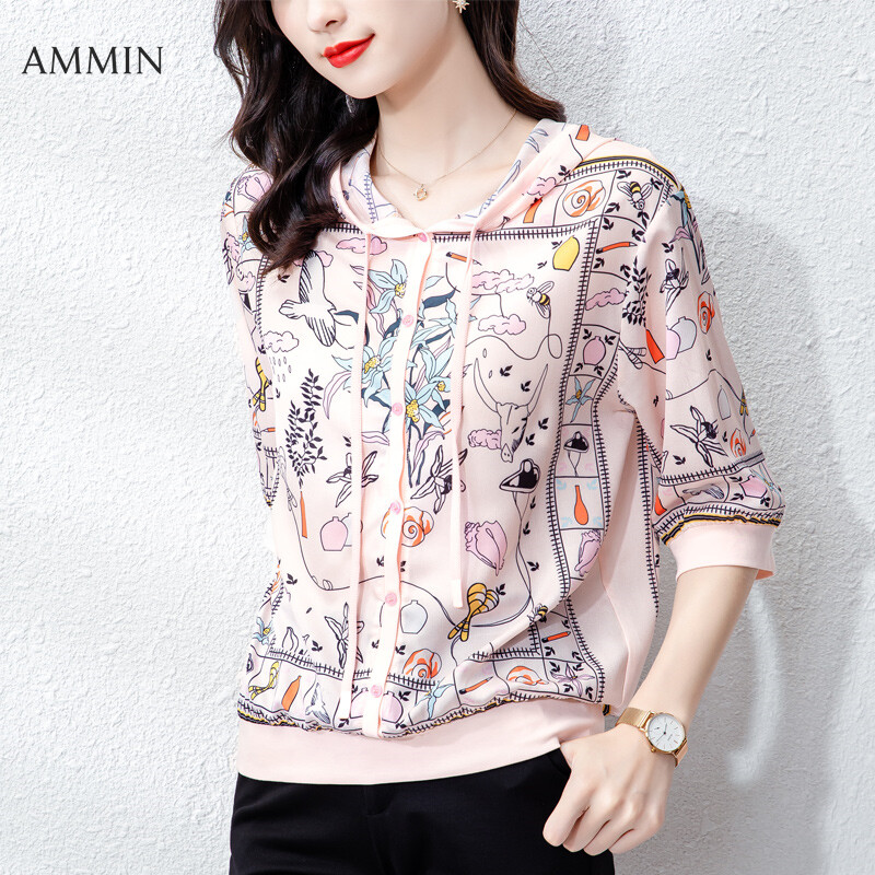 AMMIN Tops 2021 summer new high-end floral print hooded lace elegant T-shirt women's summer short-sleeved button cardigan sunscreen silk blouse