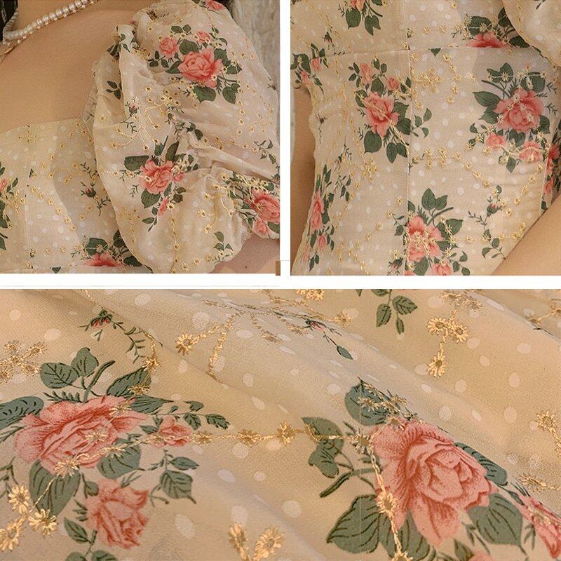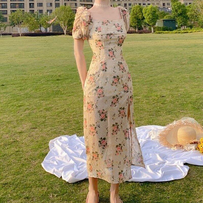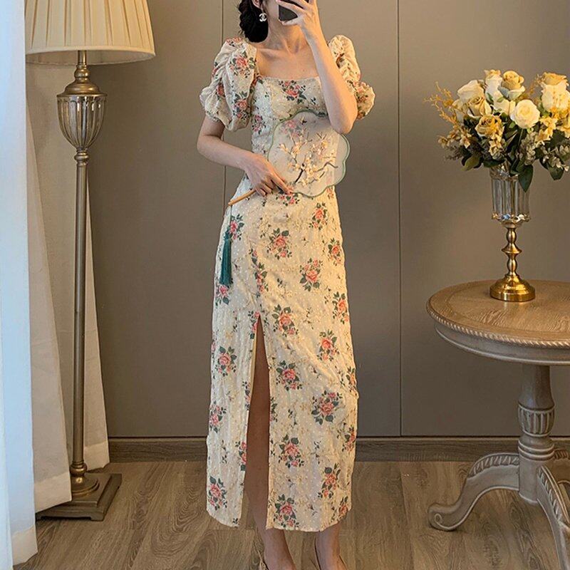 INWPLLR New Arrival Floral Print Women's Dress Fashion Elegant Square Collar Long Dress Summer Style Puff Sleeve Split Dresses Female