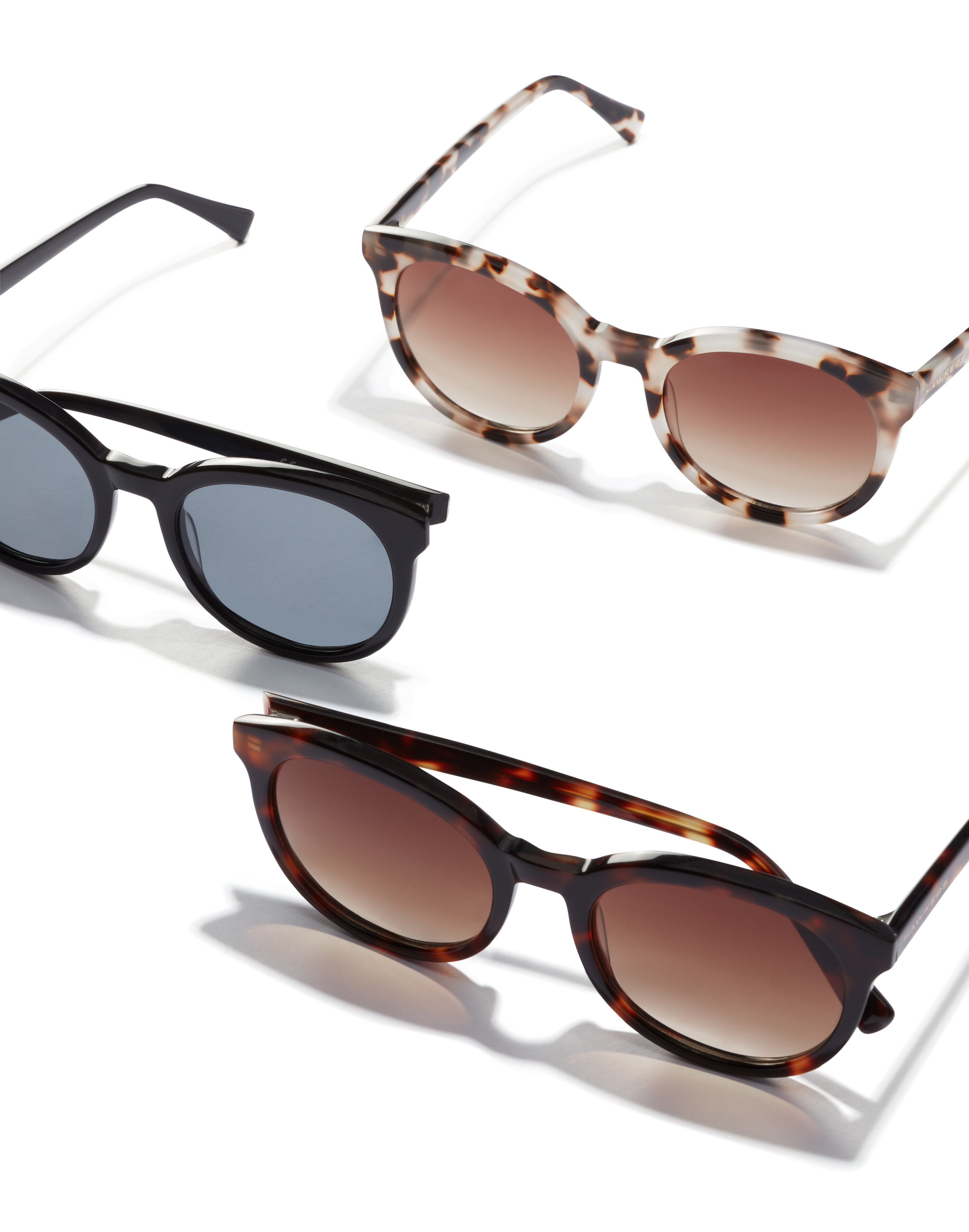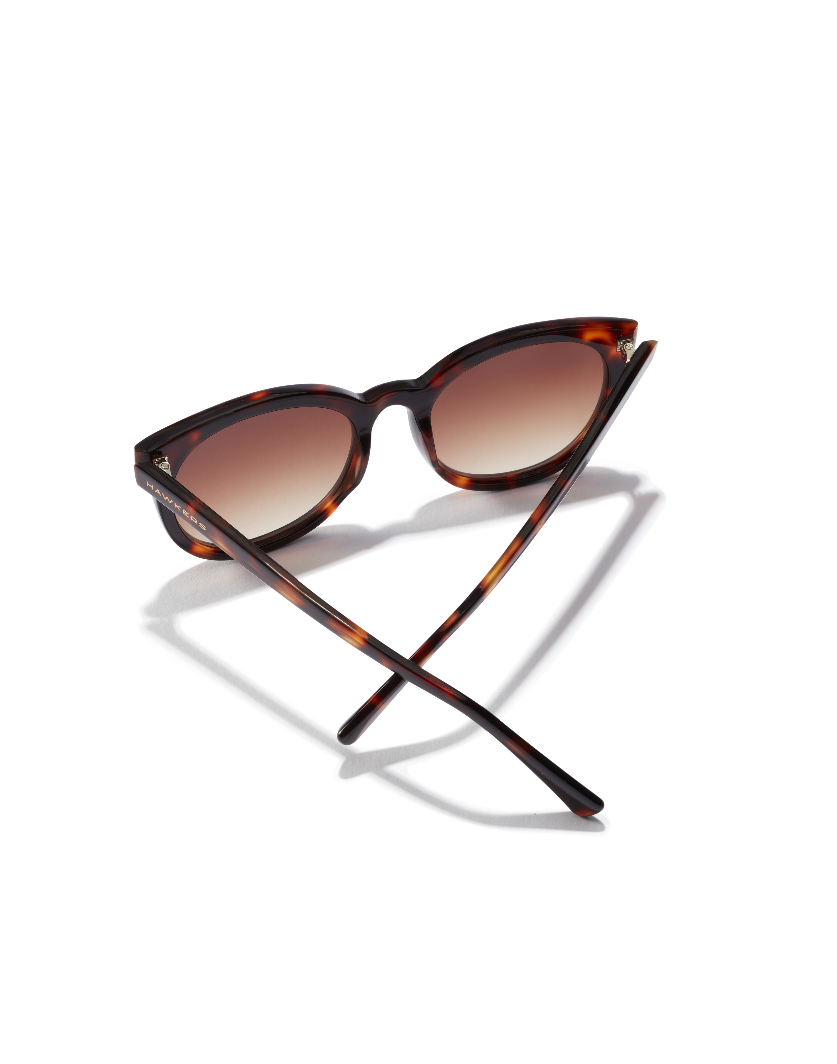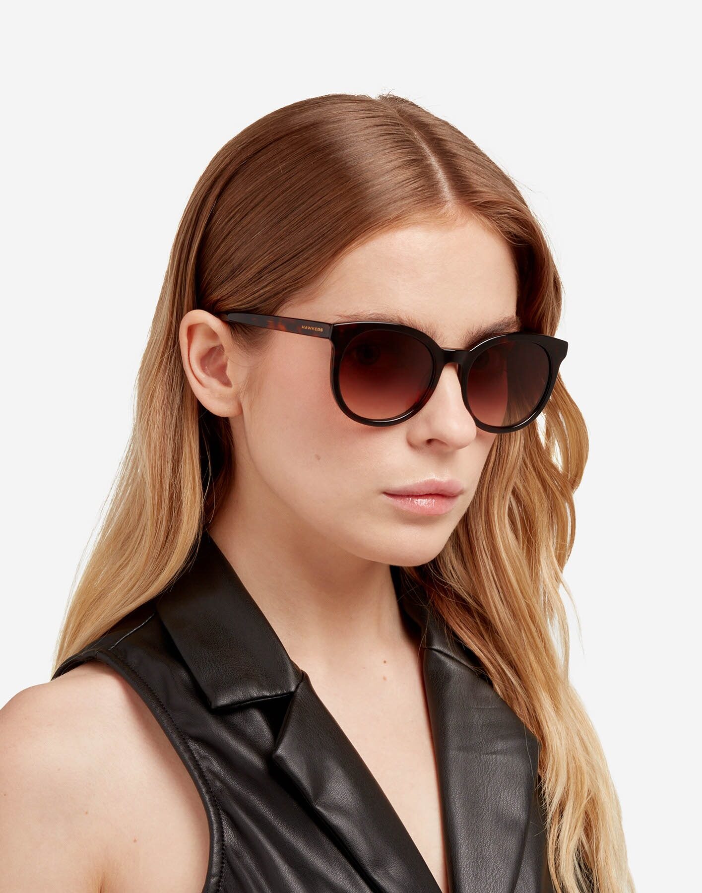The gradient brown lenses of this model complement the dark tortoiseshell print of the frame. Inspired by classic 1960s panto designs, the end pieces are placed marginally higher for a pseudo cat eye effect.