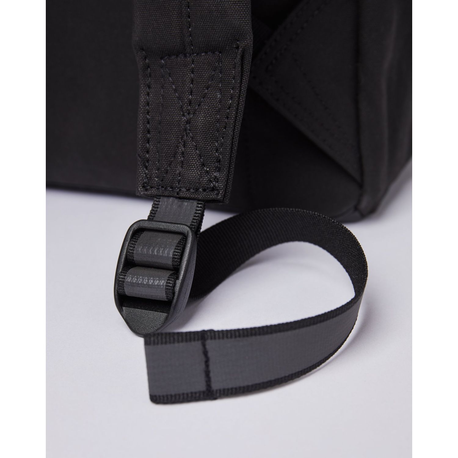 Rolltop backpack made from organic cotton and recycled polyester. A 100% vegan bag featuring a 15" laptop compartment and can carry 18 L. Fill the bag up to the rolltop and it can fit 21 L. The bottom and front of the bag is treated with a silk print coating for extra water resistance. FEATURES