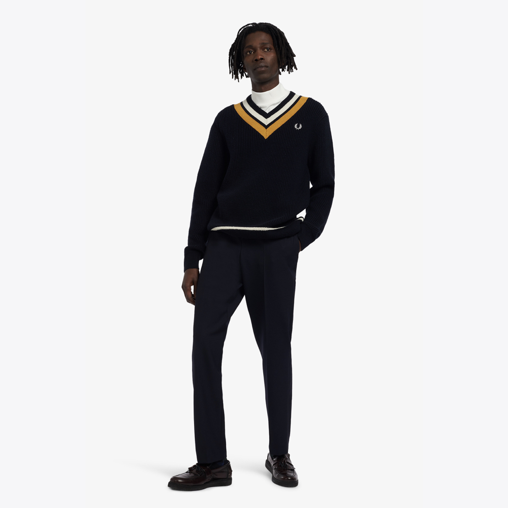A V-neck tennis jumper knitted in a blend of wool and cotton. Designed with a relaxed fit and a contrast stripe design.