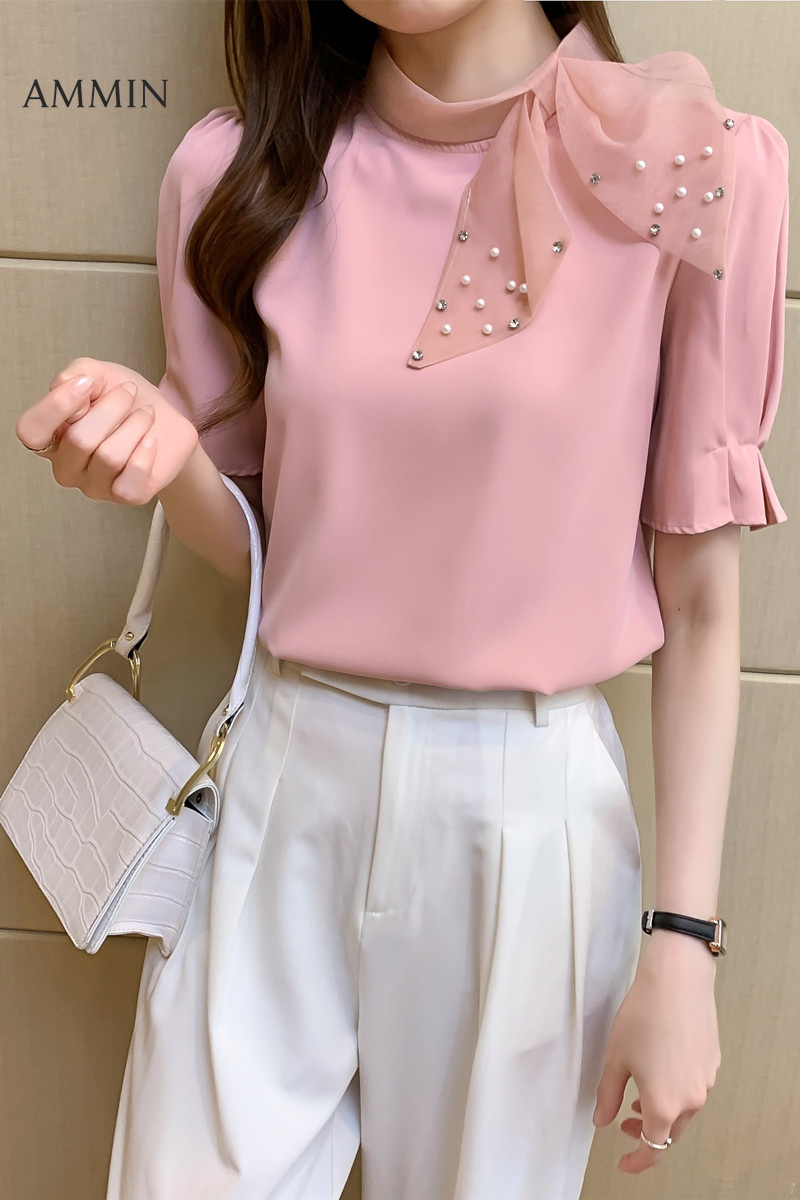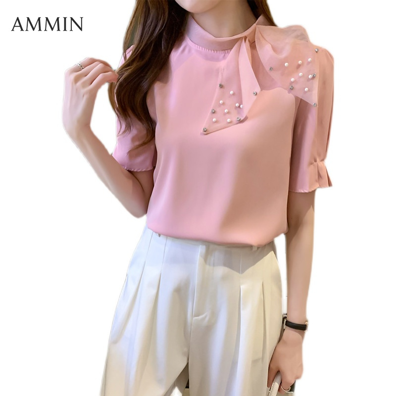 AMMIN Korean style new bow short-sleeved chiffon shirt For woman fashion design sense beaded high-end self-cultivation all-match Tops Blouse