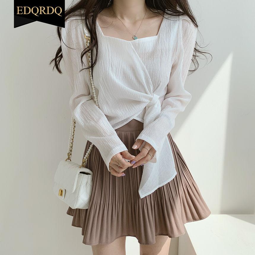 EDQRDQ Women's Casual Puff Sleeve Long Sleeve Square Neck Bow Self Tie Slim Fit Crop Tee Tops