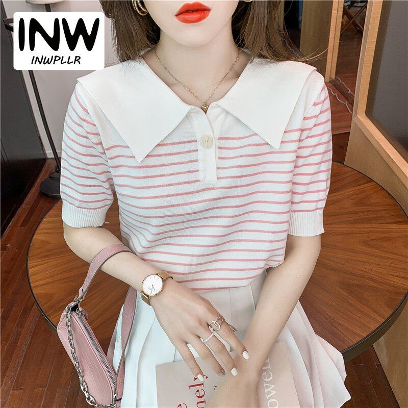 INWPLLR Pretty Navy Neck Chic Tops Women's Western Style Striped T-Shirts Leisure Fashion Short-sleeves T-shirts Lady