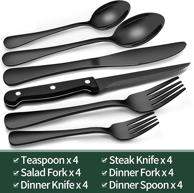 24-piece black silverware set with steak knives, black cutlery set, 4-piece set, food-grade stainless steel cutlery set, mirror-polished cutlery set for home dining