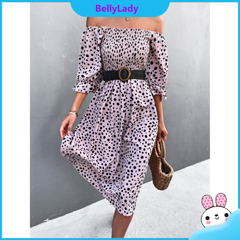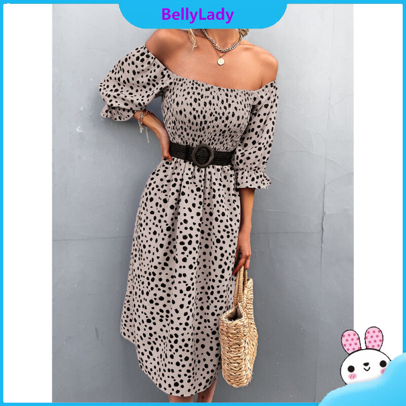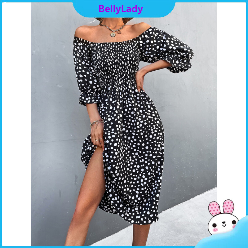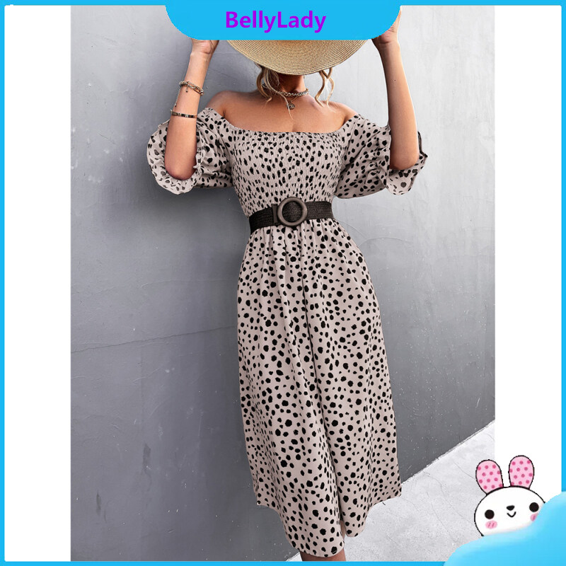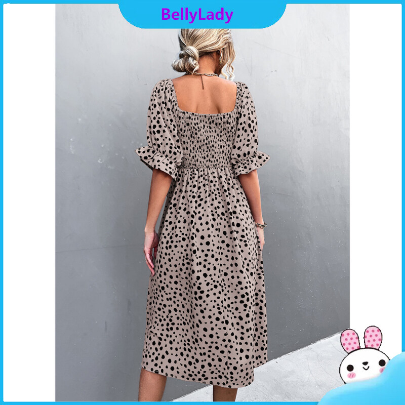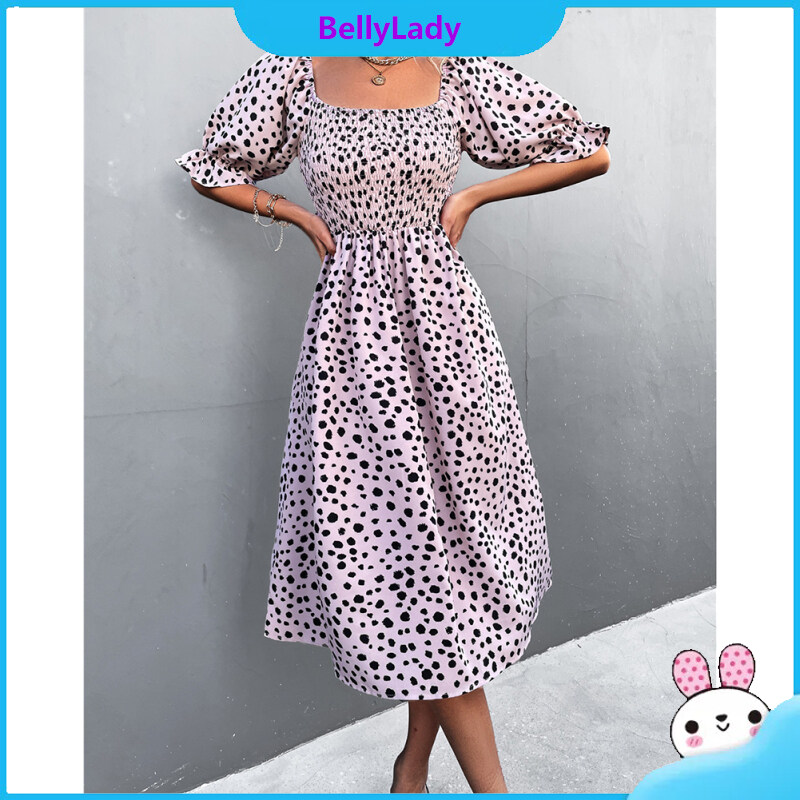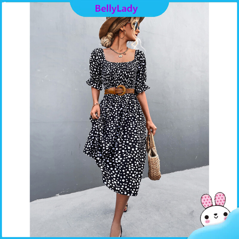 Women Retro Square Collar Dress Polka Dot Printing Puff Sleeve A-line Skirt High Waist Half Sleeves Dress