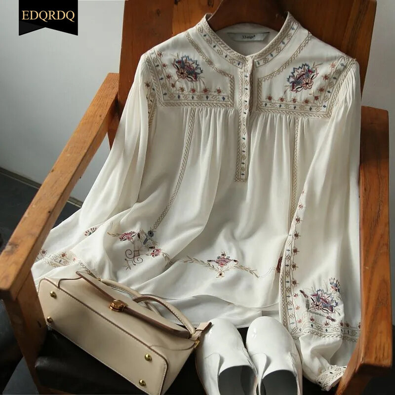 EDQRDQ Floral Bohemian Tops Muslim O Neck Puff Sleeve Elegant Blouses for Women