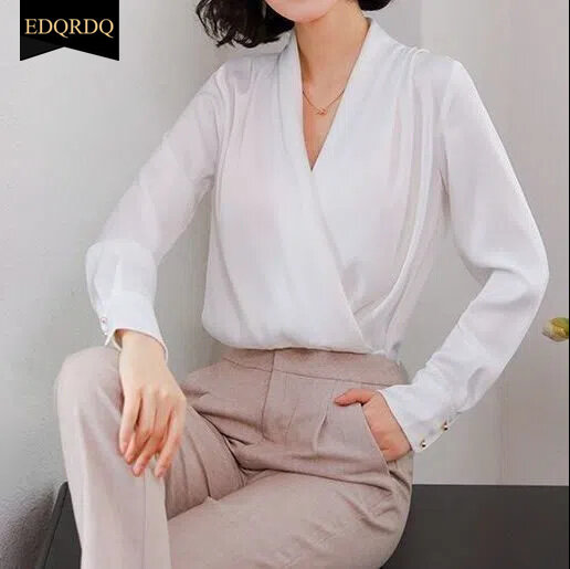 EDQRDQ Women's Casual Chiffon Tops V Neck Long Sleeve Elegant Shirts Wrap Blouses