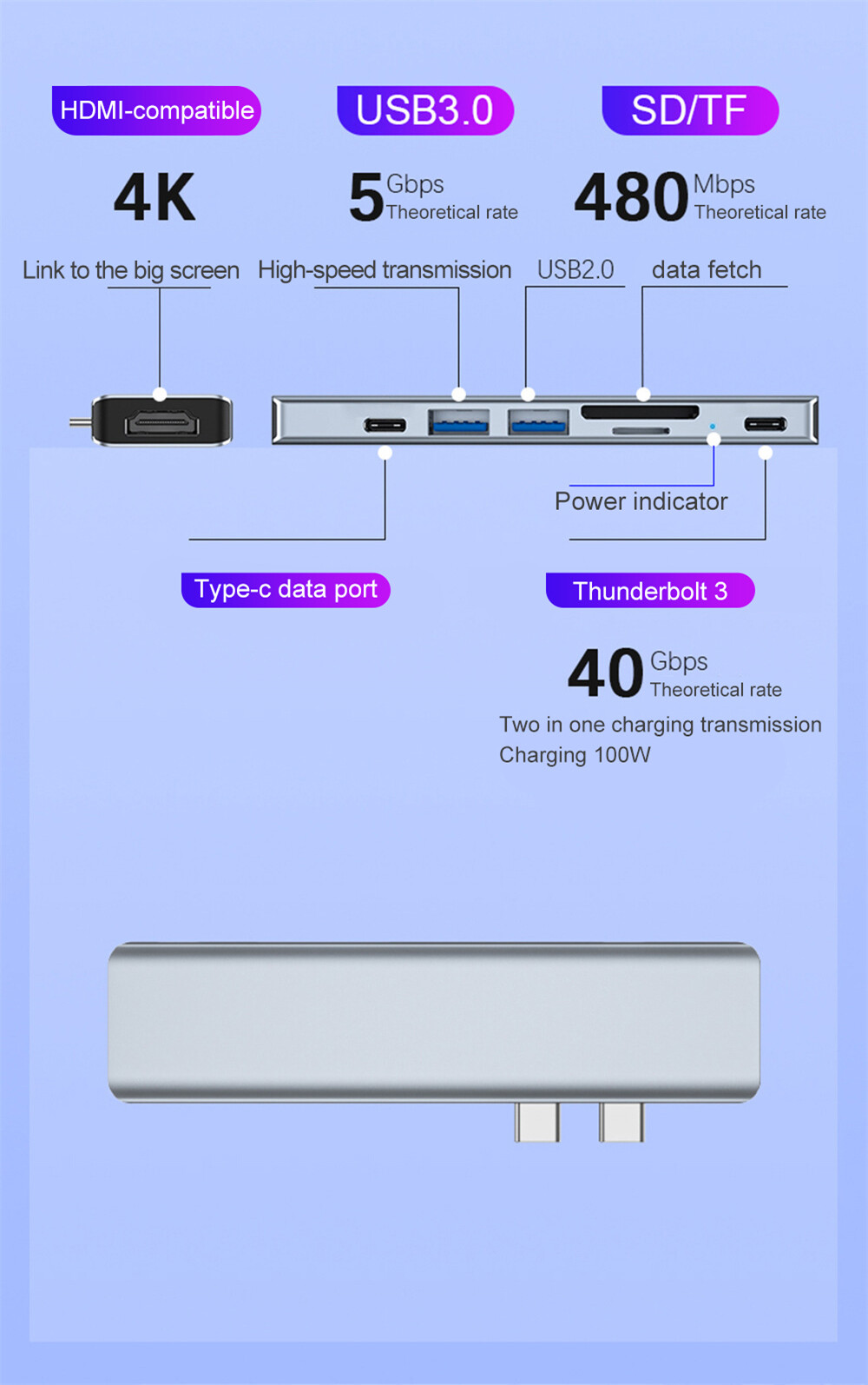 Female interface: HDMI-compatible*1+USB3.0*1+USB2.0*1+PD87W**1+SD*1+TF*1+PD2.0*1