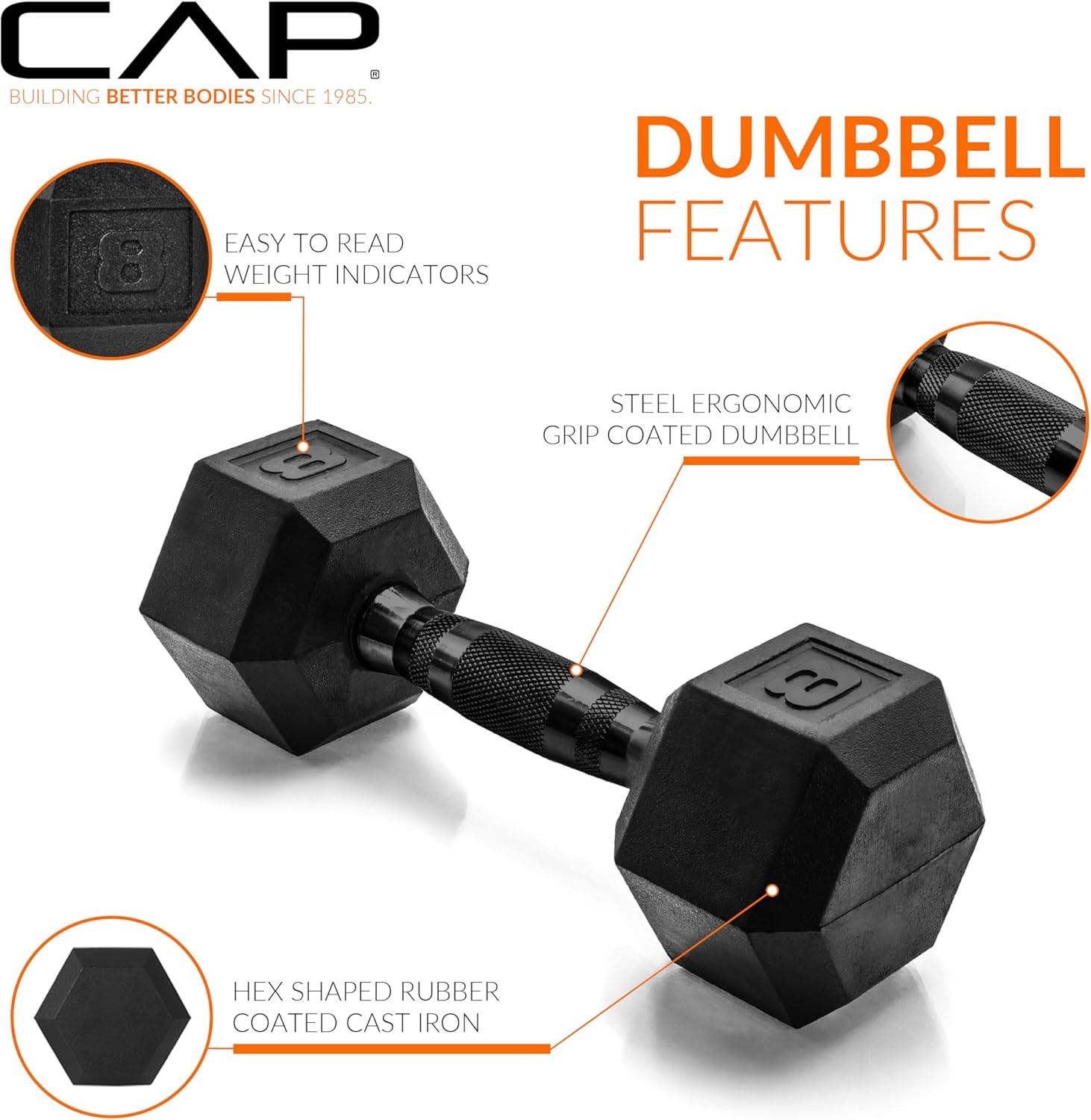 Selection: This Cap dumbbell set is available in 3, 5, 8, 10, 12, 15, and 50 lb. weights, in 5 lb. increments. Includes a 30-day manufacturer's warranty.